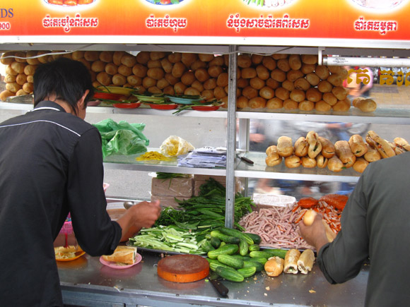 - Num Pang (Baguette Sandwich)- Located all over the city. For an awesome experience go to the Wat Phnom Garden round-a-bout near the Cambodian-Japanese Friendship Bridge.