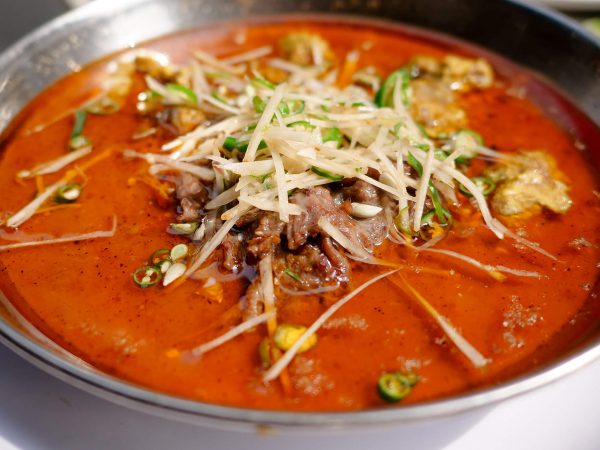 Small red plastic tables, and little stools were set up in a line along the side of the road, and customers sat on the side of the wall, scarfing down breakfast with smiles on their faces.